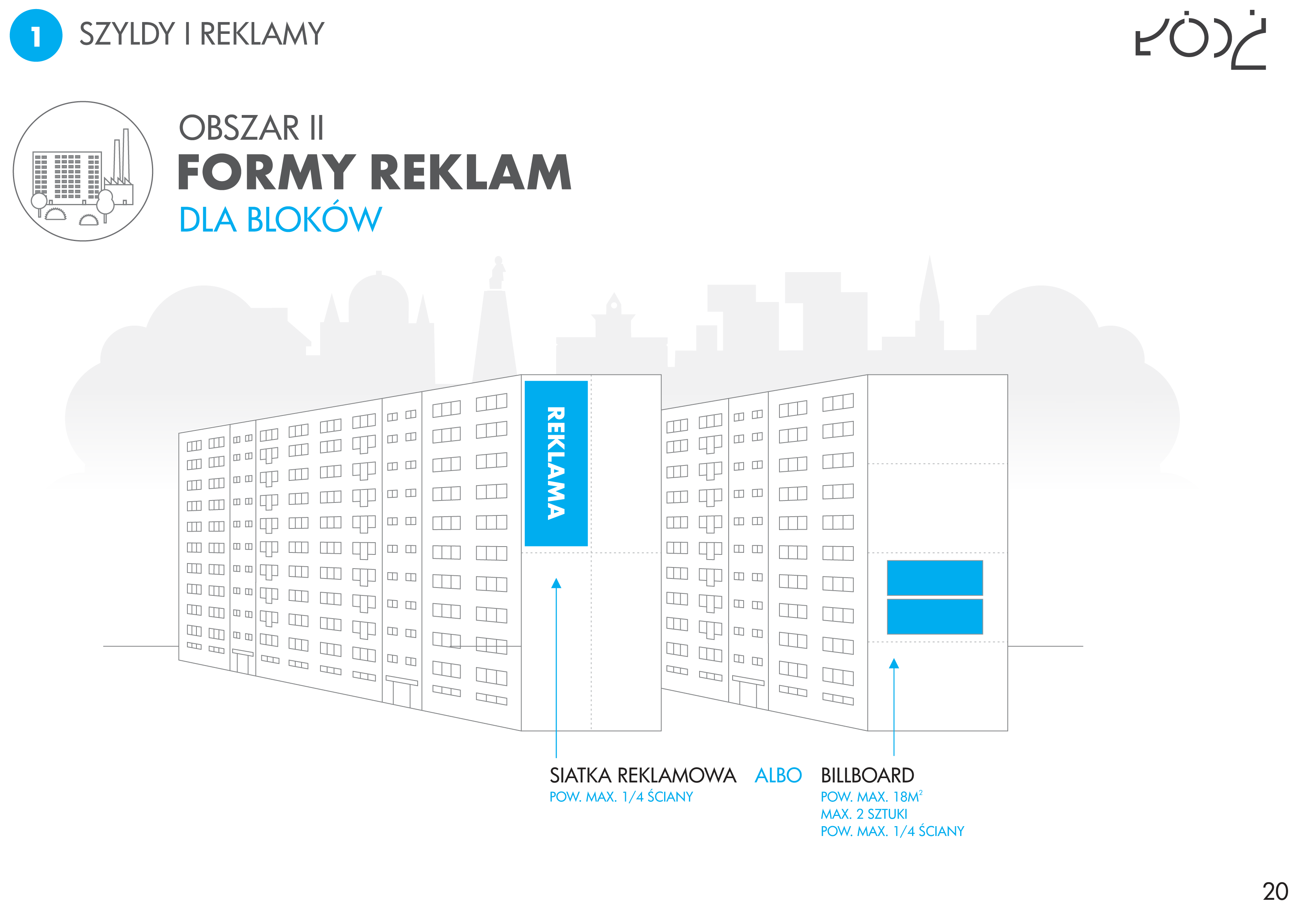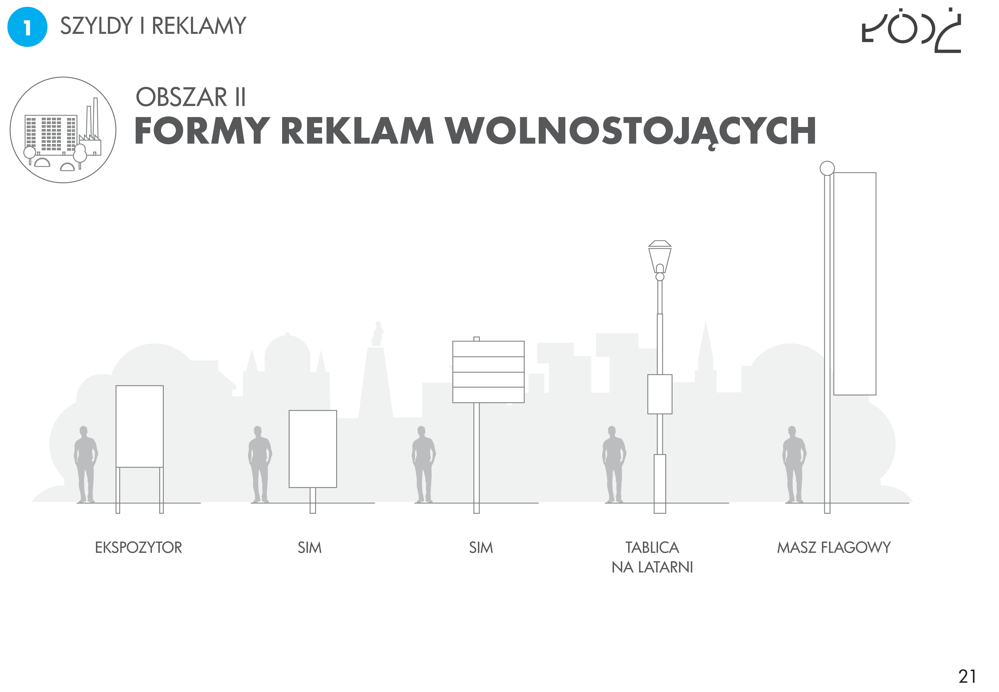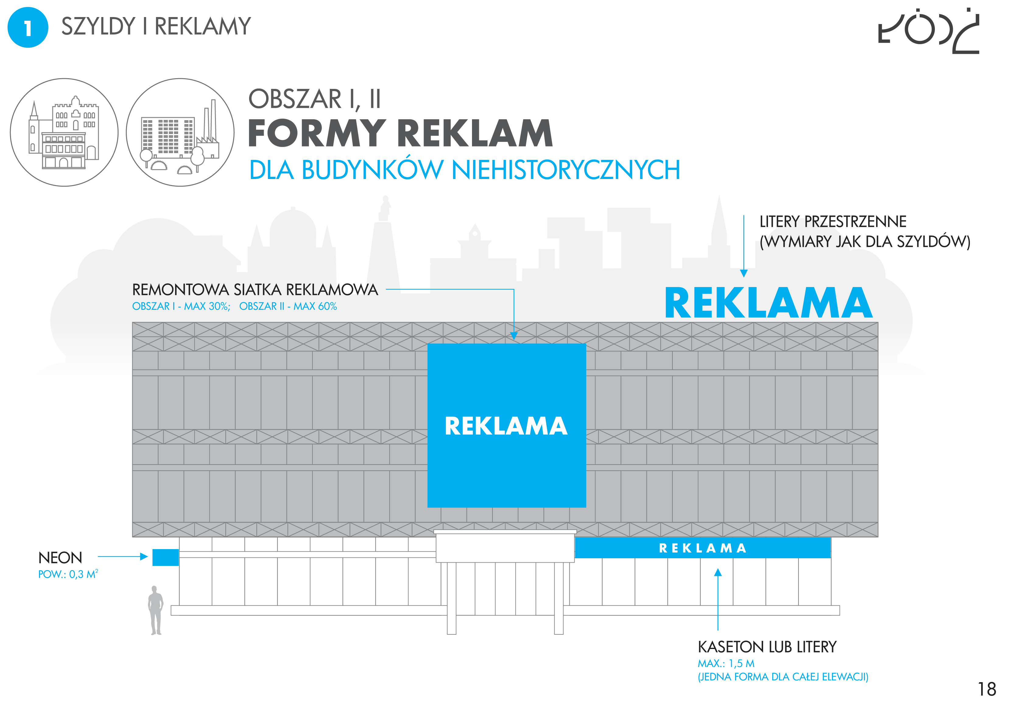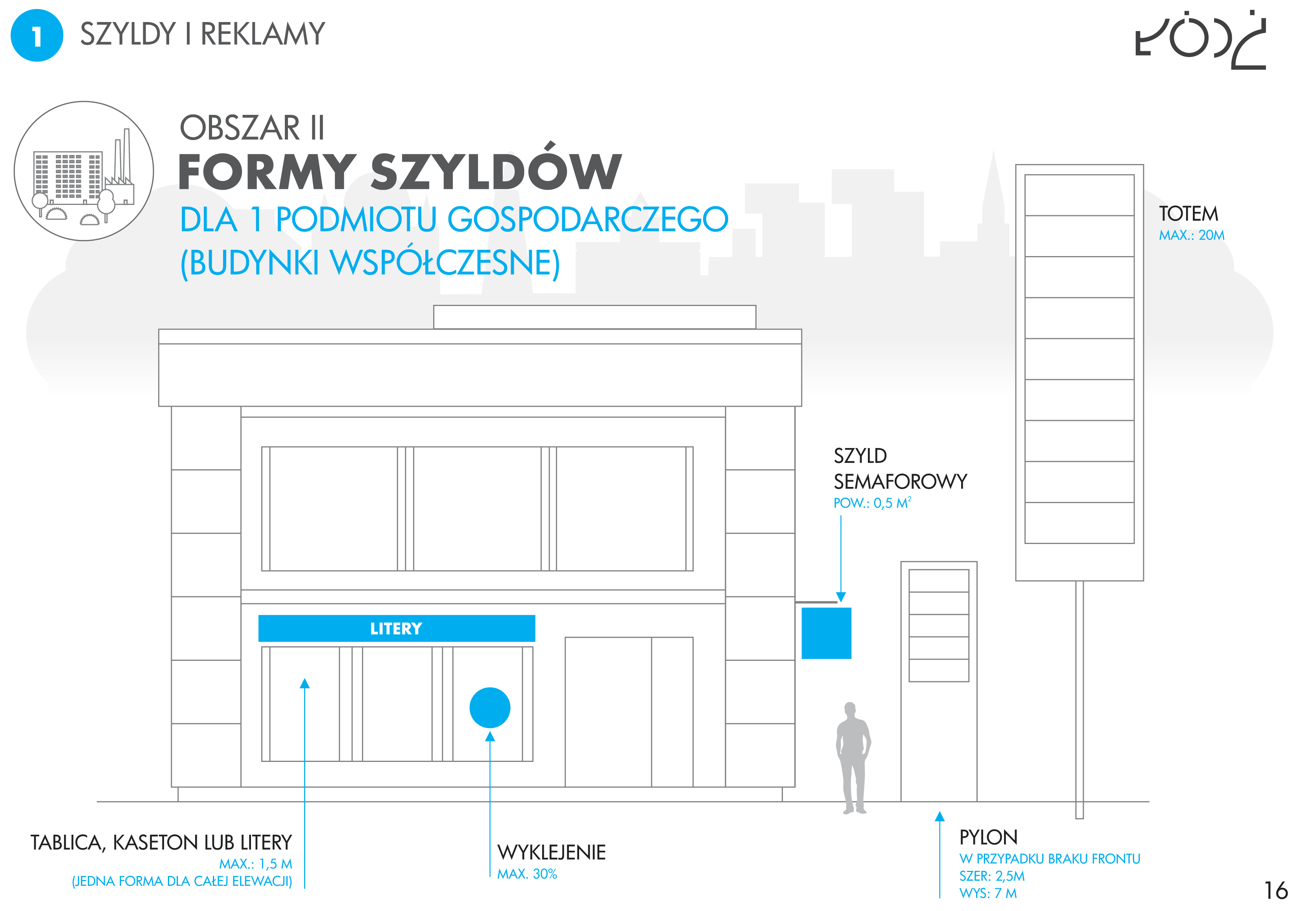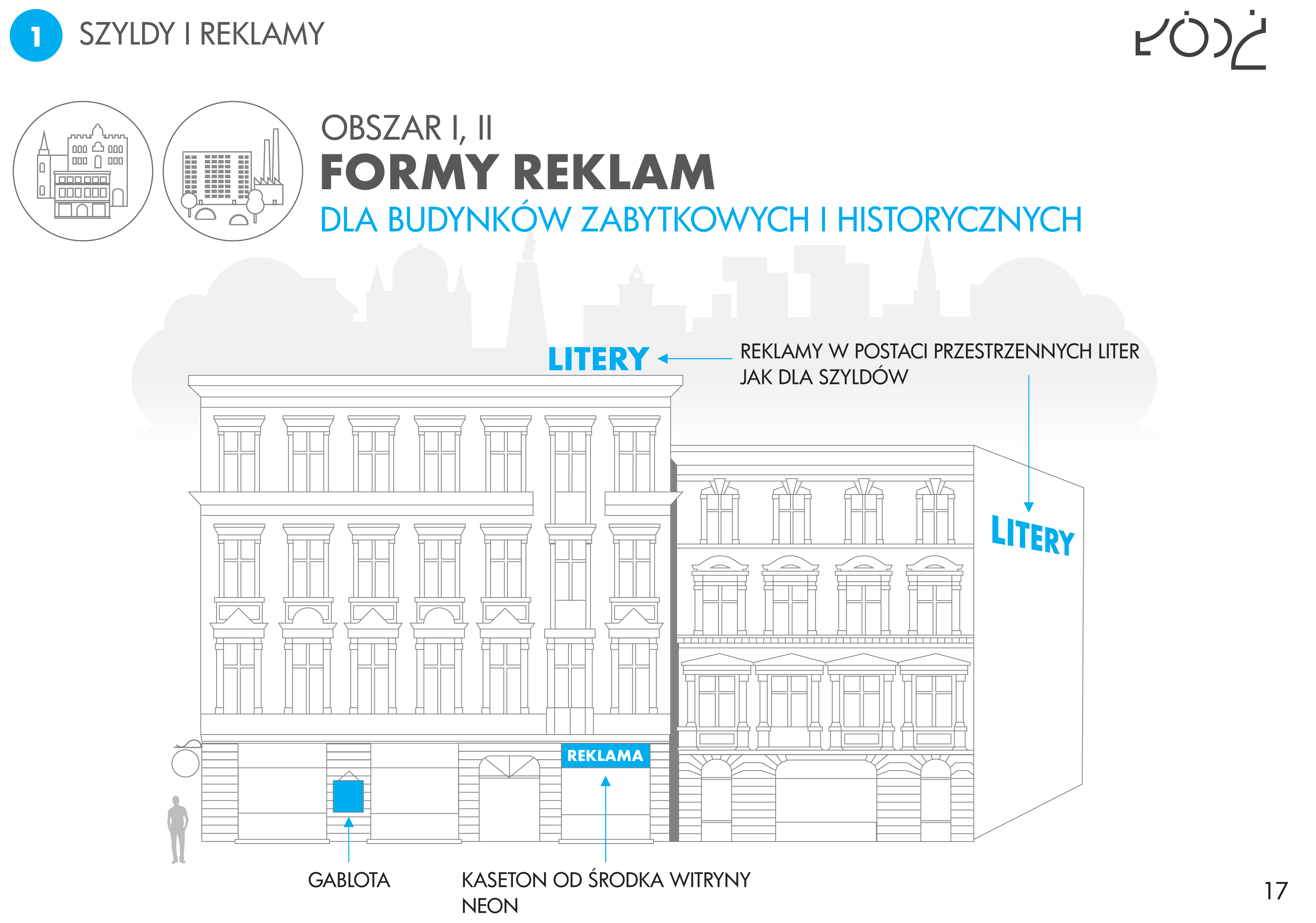 Ilustracje w uproszczony sposób pokazują zasady, według których należy projektować i umieszczać reklamy na terenie miasta. Należy pamiętać, że podstawowym dokumentem jest dokument w formie tekstu czyli uchwała Rady Miasta z dnia 16 grudnia 2016 r.