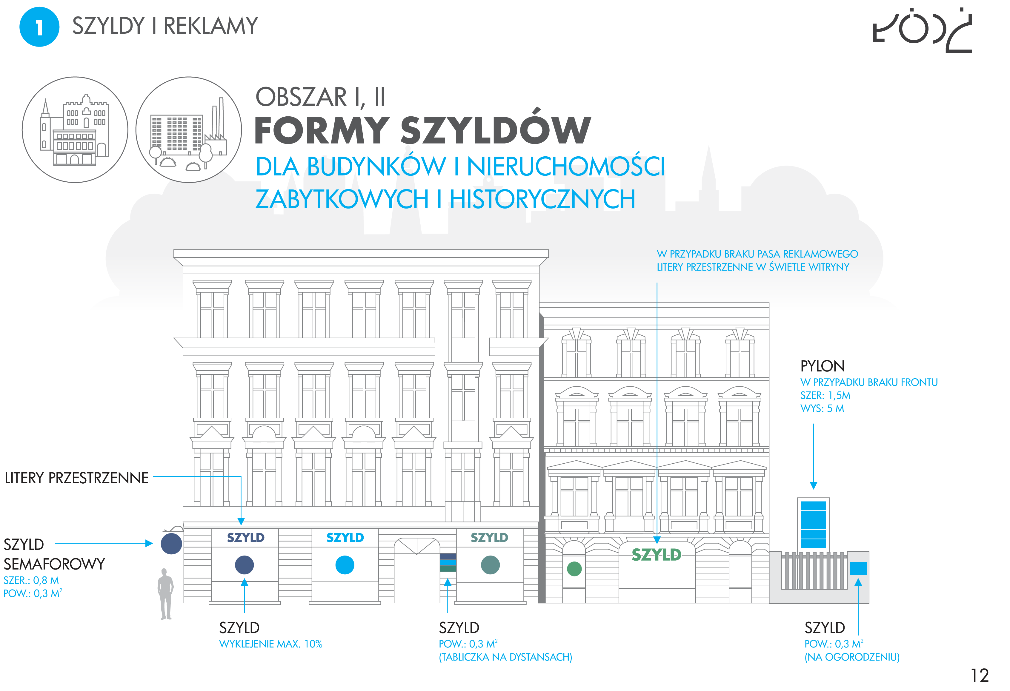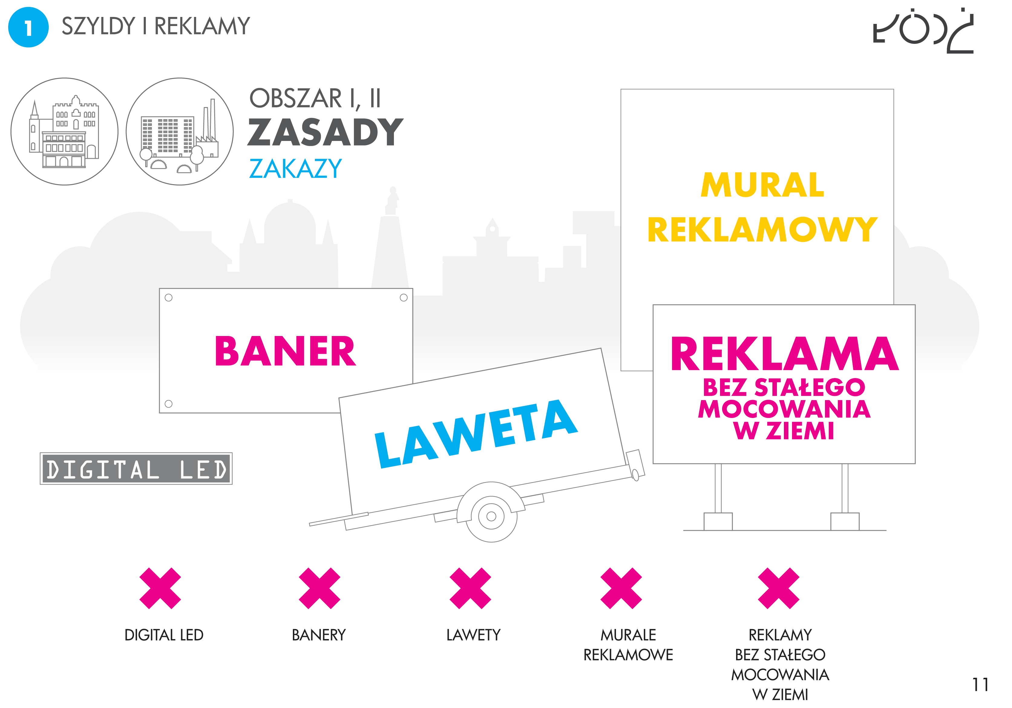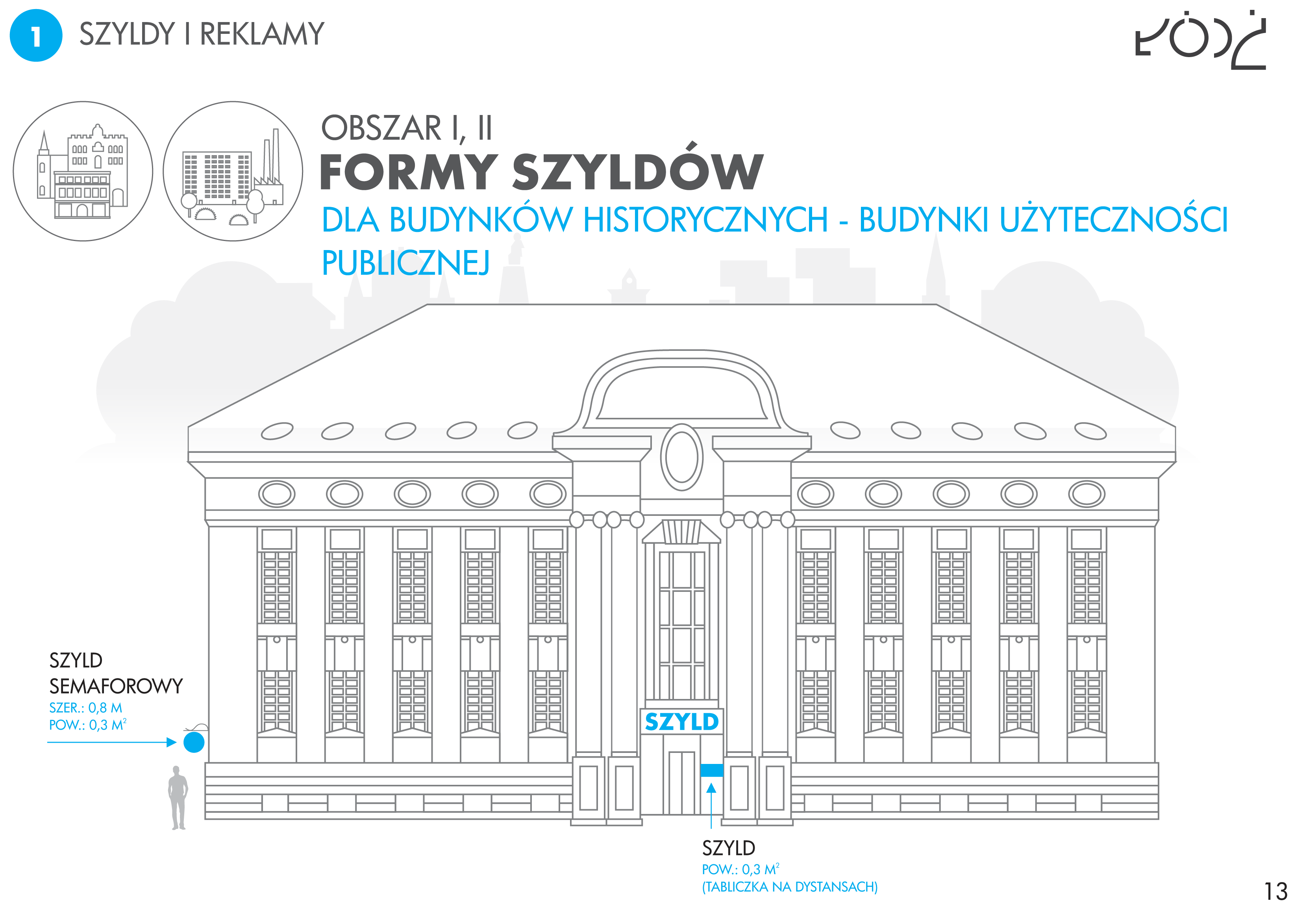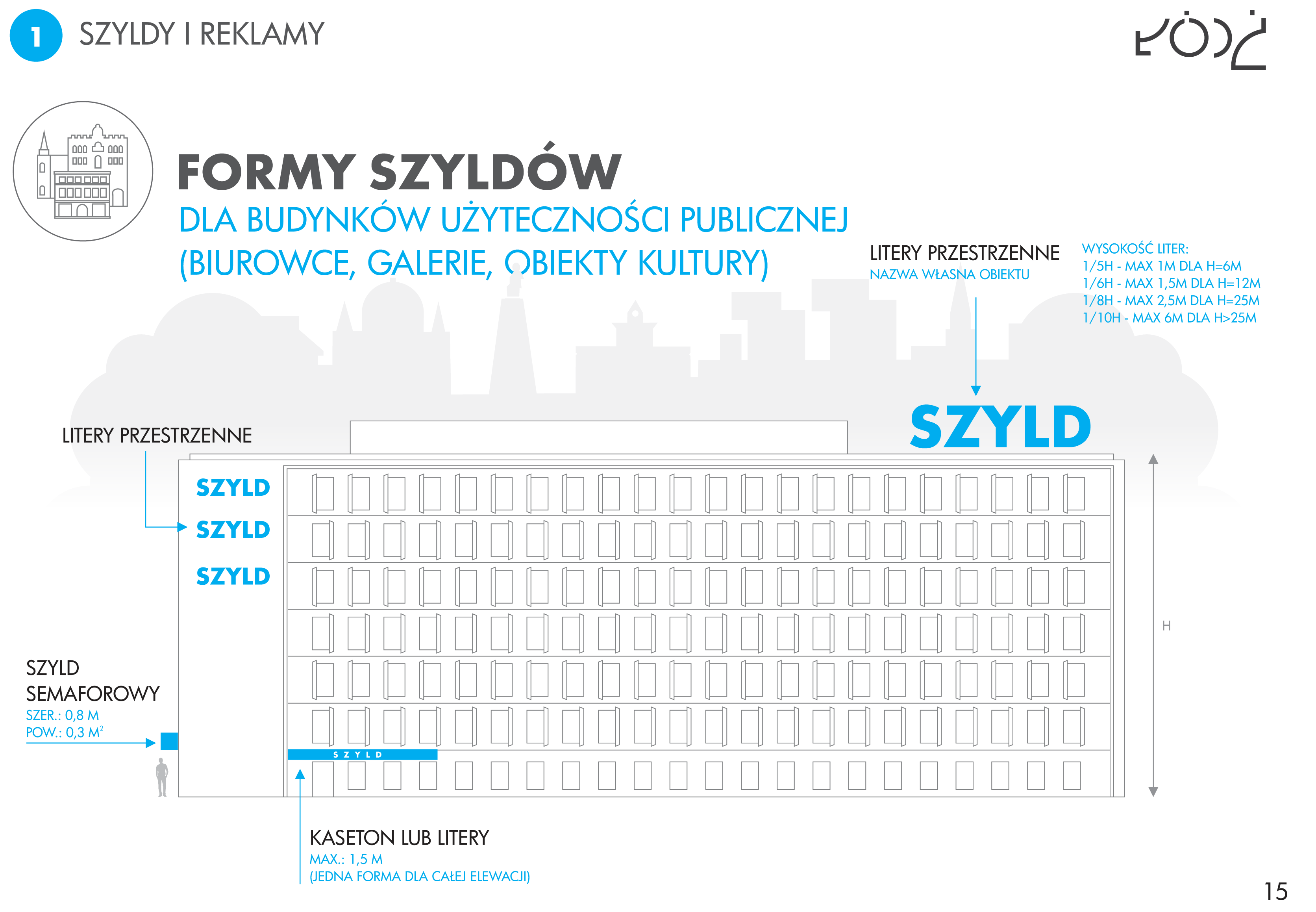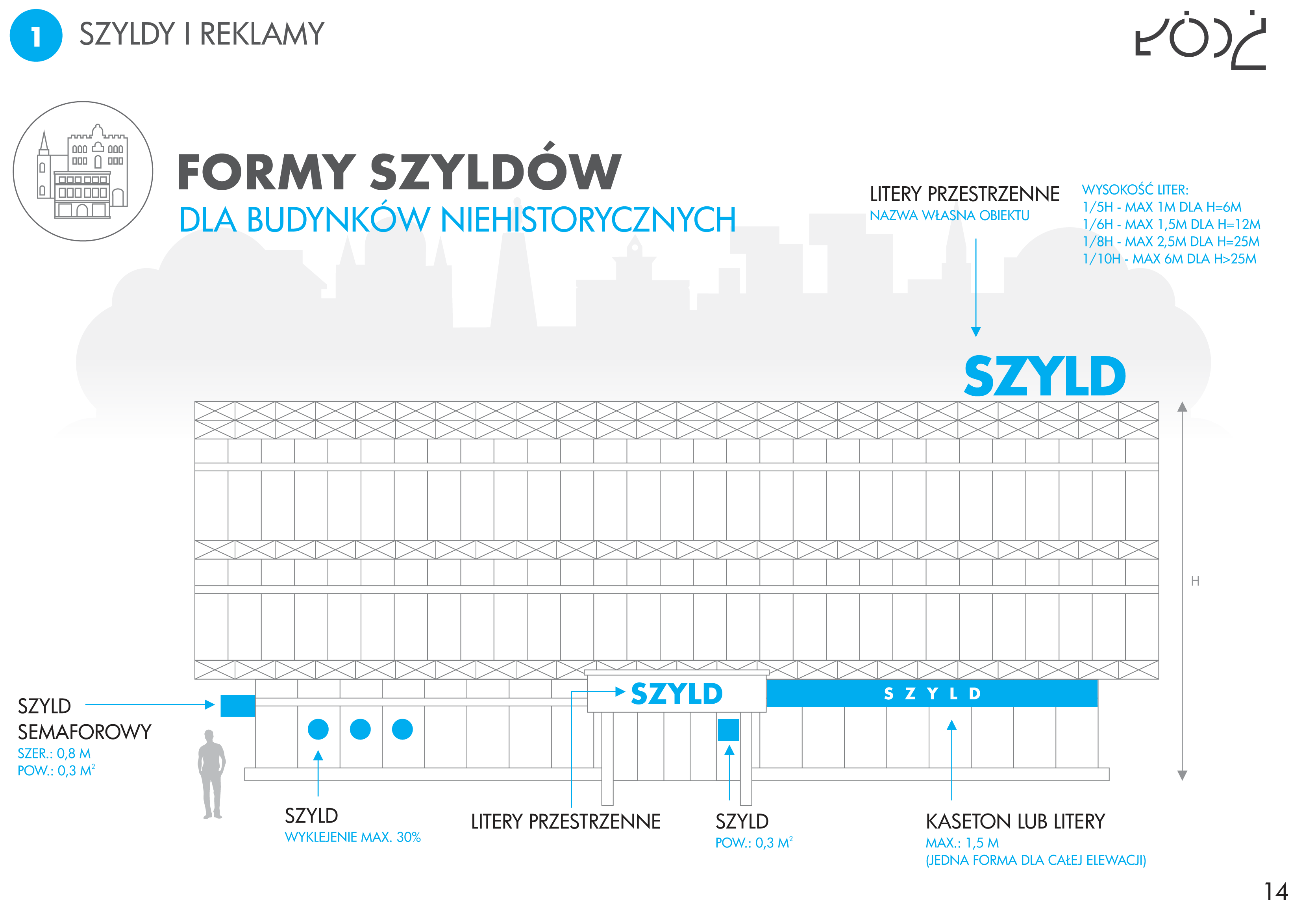 Ilustracje w uproszczony sposób pokazują zasady, według których należy projektować i umieszczać reklamy na terenie miasta. Należy pamiętać, że podstawowym dokumentem jest dokument w formie tekstu czyli uchwała Rady Miasta z dnia 16 grudnia 2016 r.