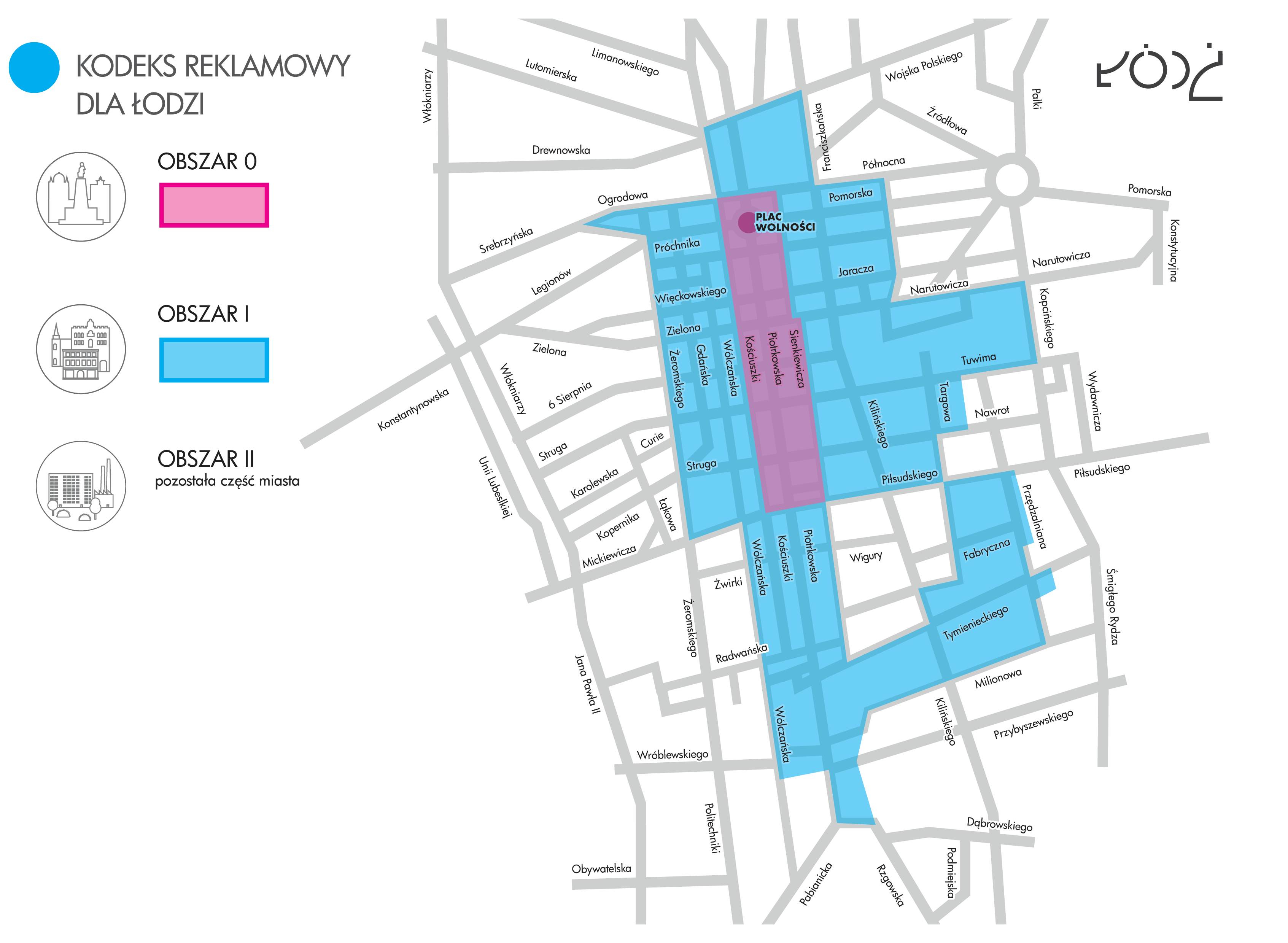 Obszar 0 - obszar Parku Kulturowego ul. Piotrkowskiej - podlega uzgodnieniom i opiniowaniu Miejskiego Konserwatora Zabytków, uchwałę regulującą przepisy dla Parku Kulturowego znajdziesz w zakładce UCHWAŁA.