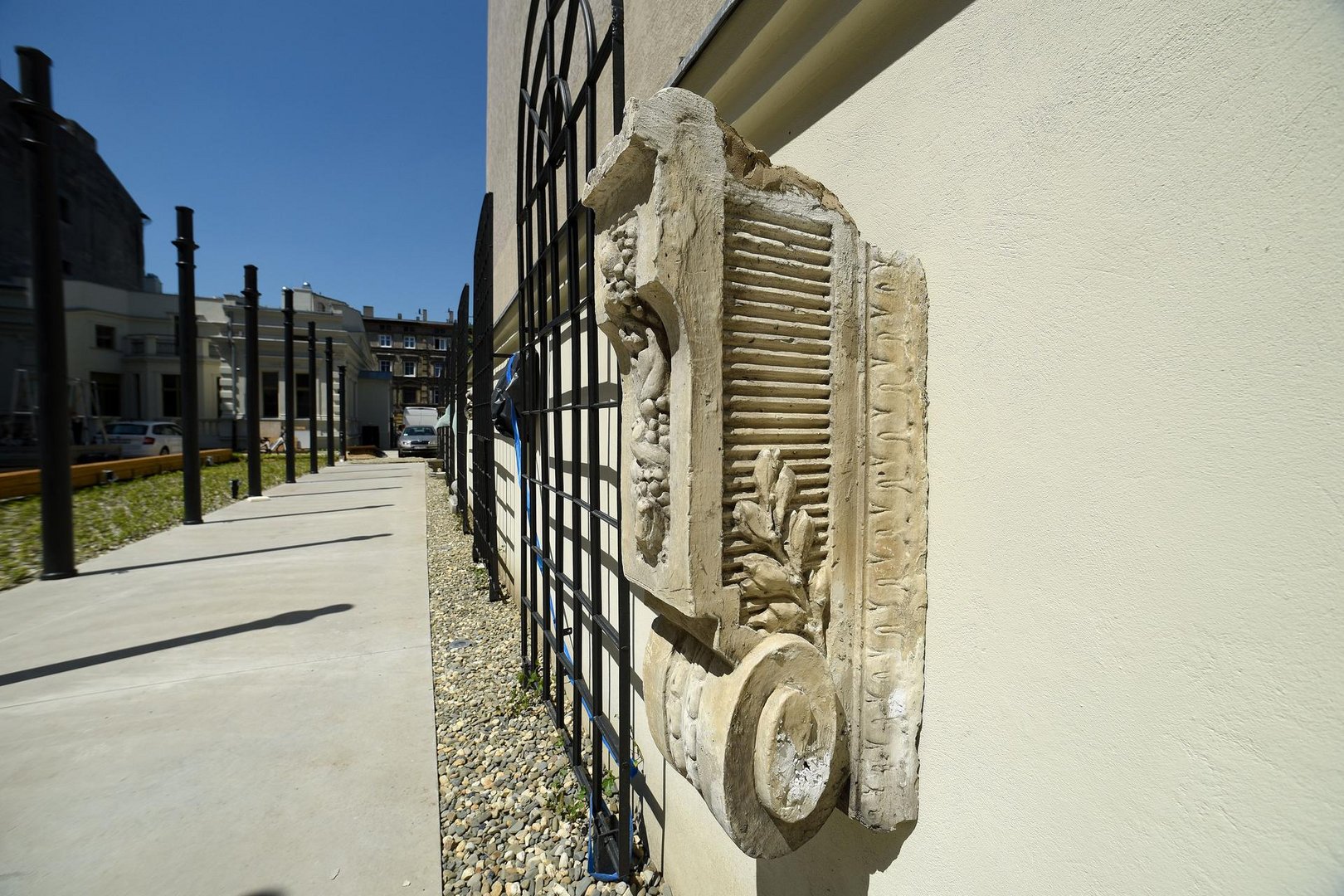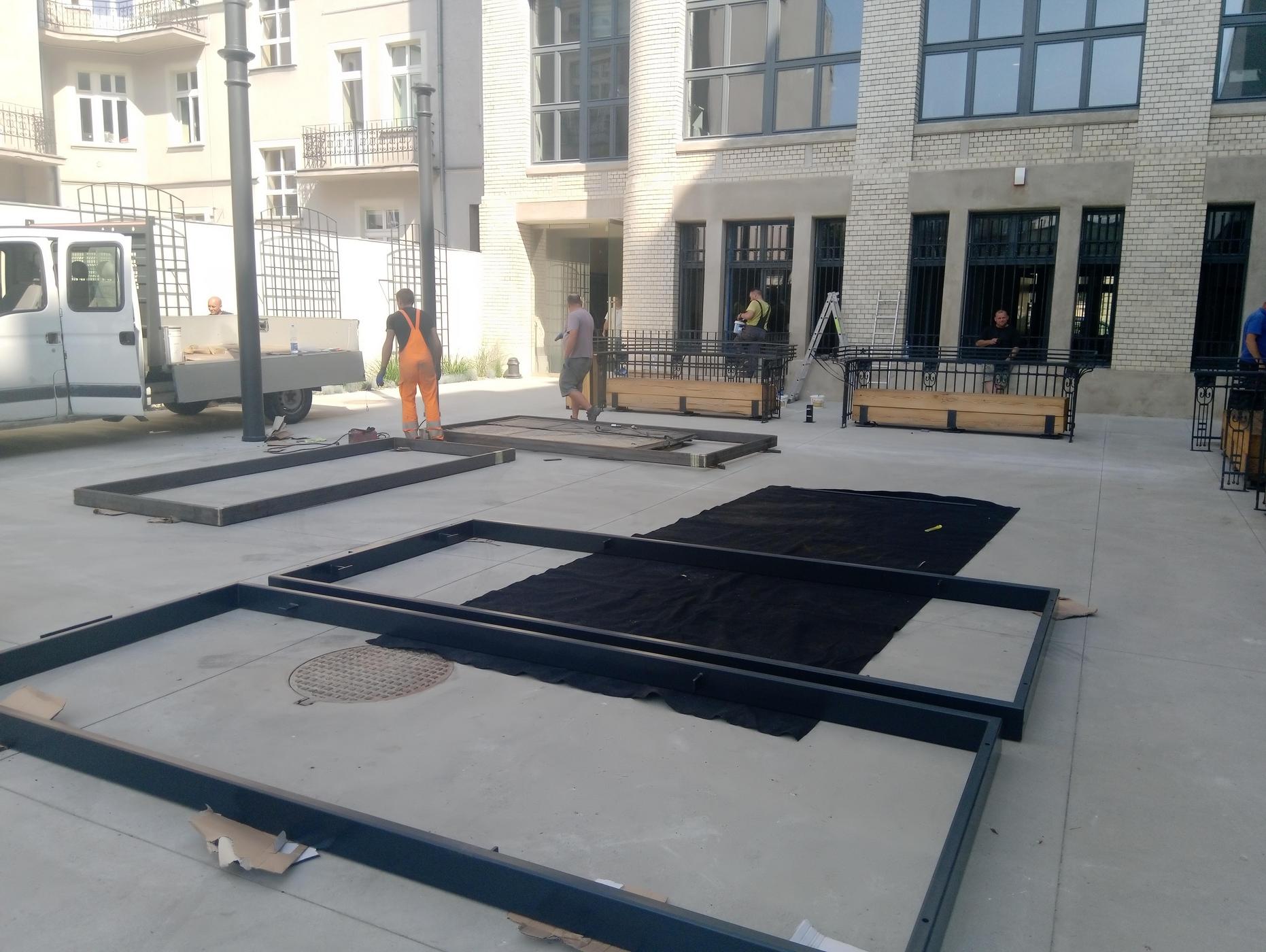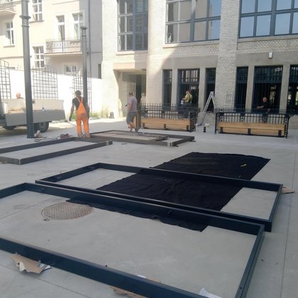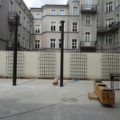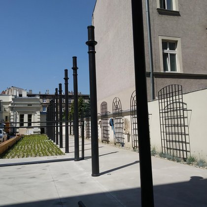 Oprócz zieleni i ławek umożliwiających wypoczynek (a także pracę na świeżym powietrzu – przy ławkach zaprojektowane zostały złącza energetyczne, do których będzie można podłączyć sprzęt elektroniczny, np. laptopy), tu także znalazły się elementy ekspozycji Lapidarium.