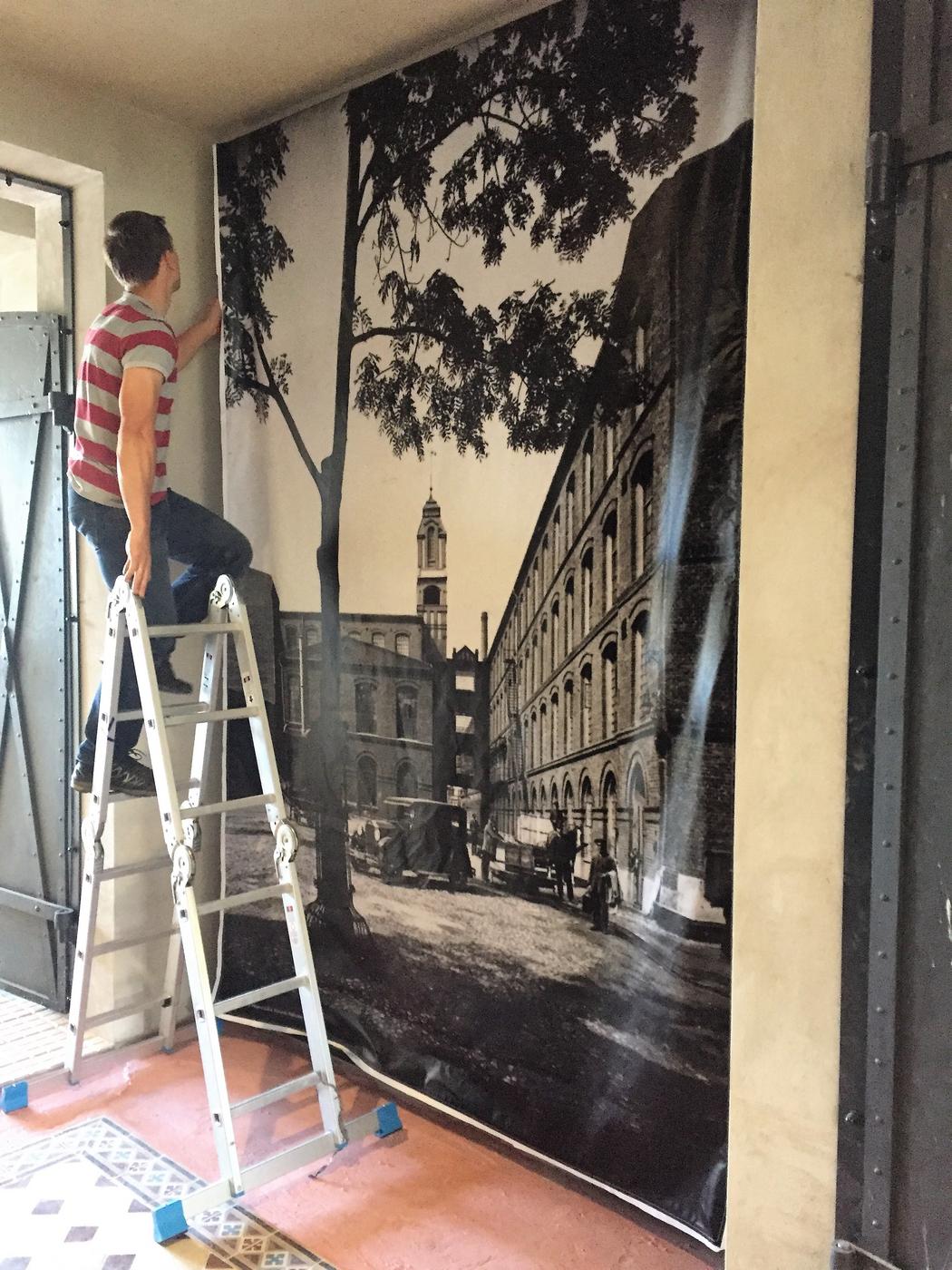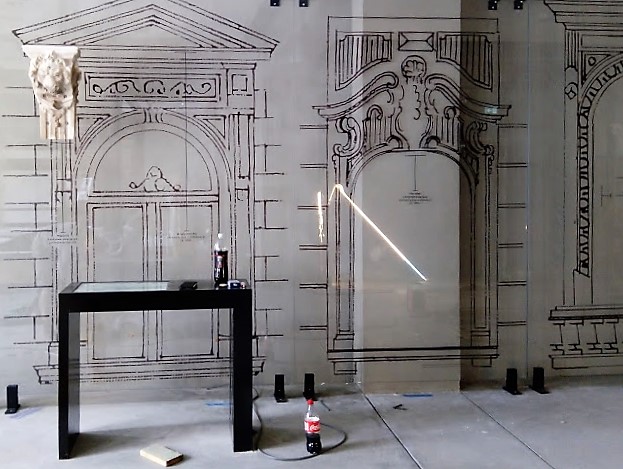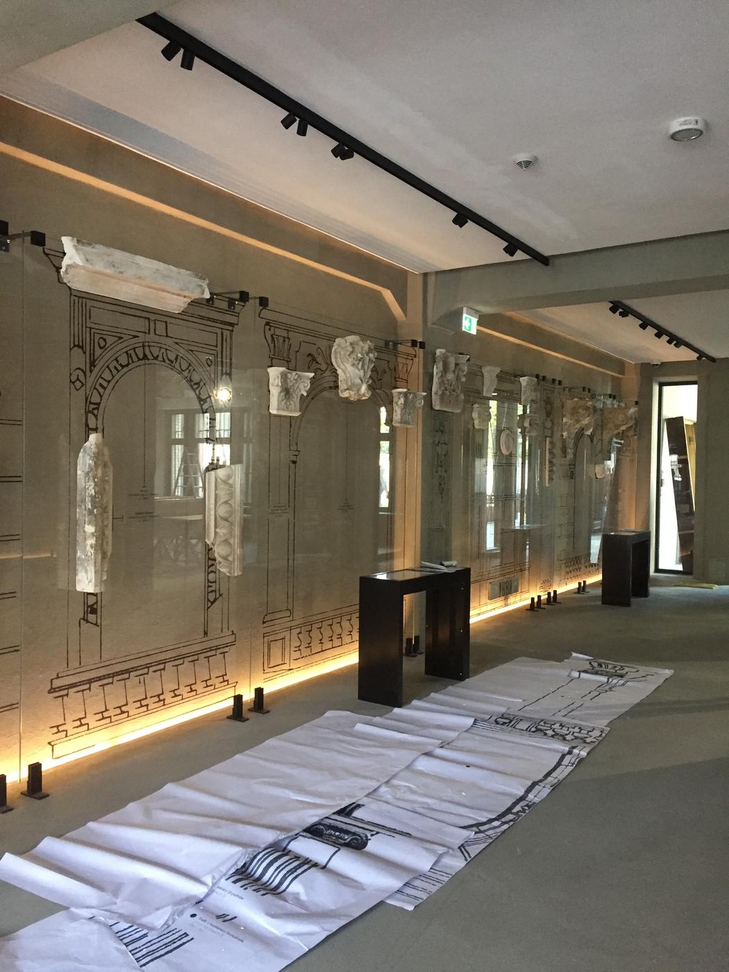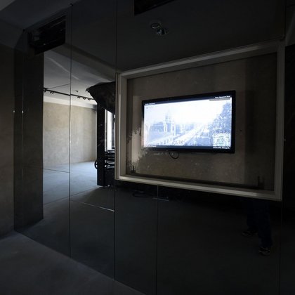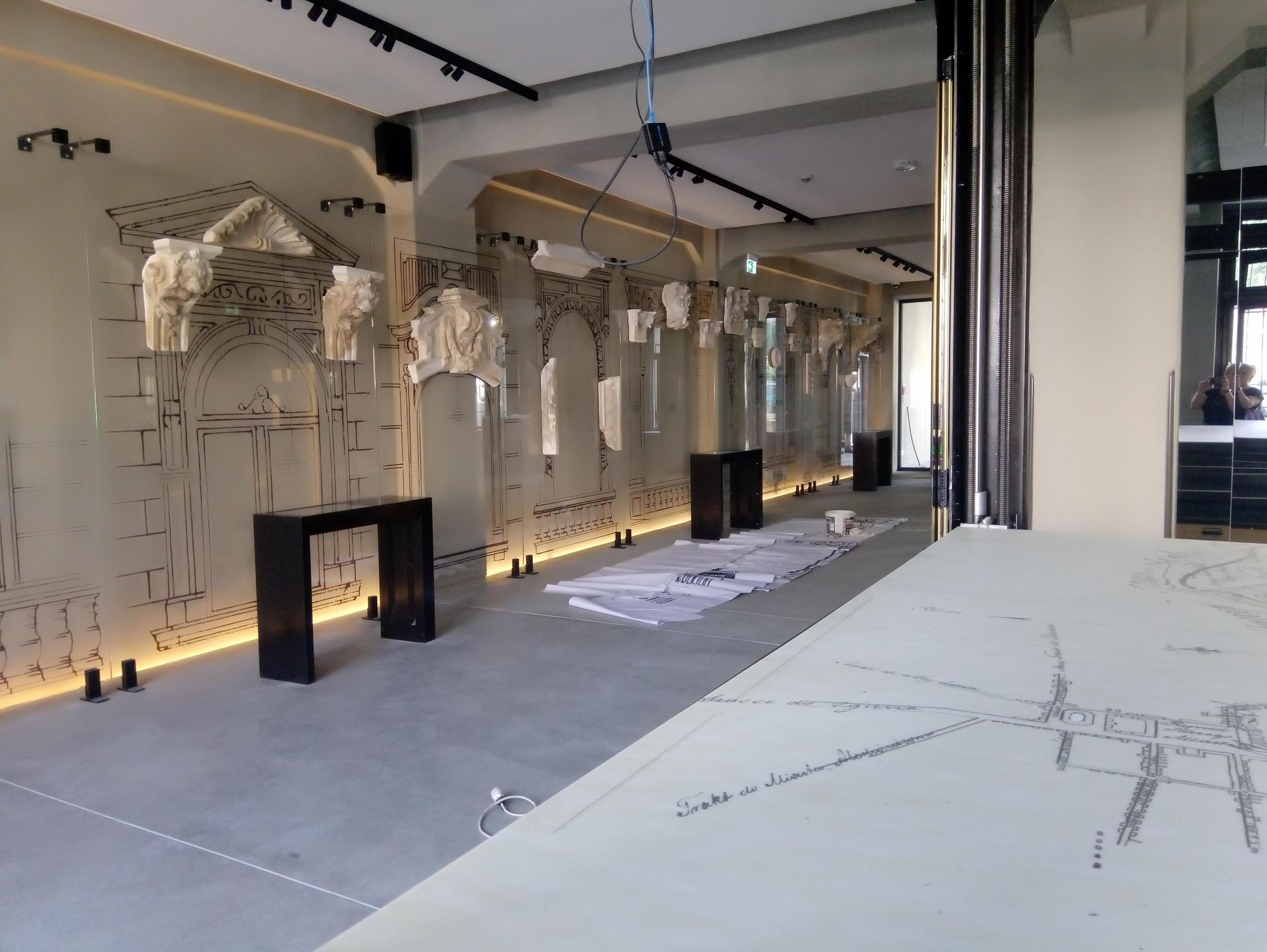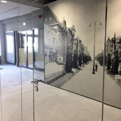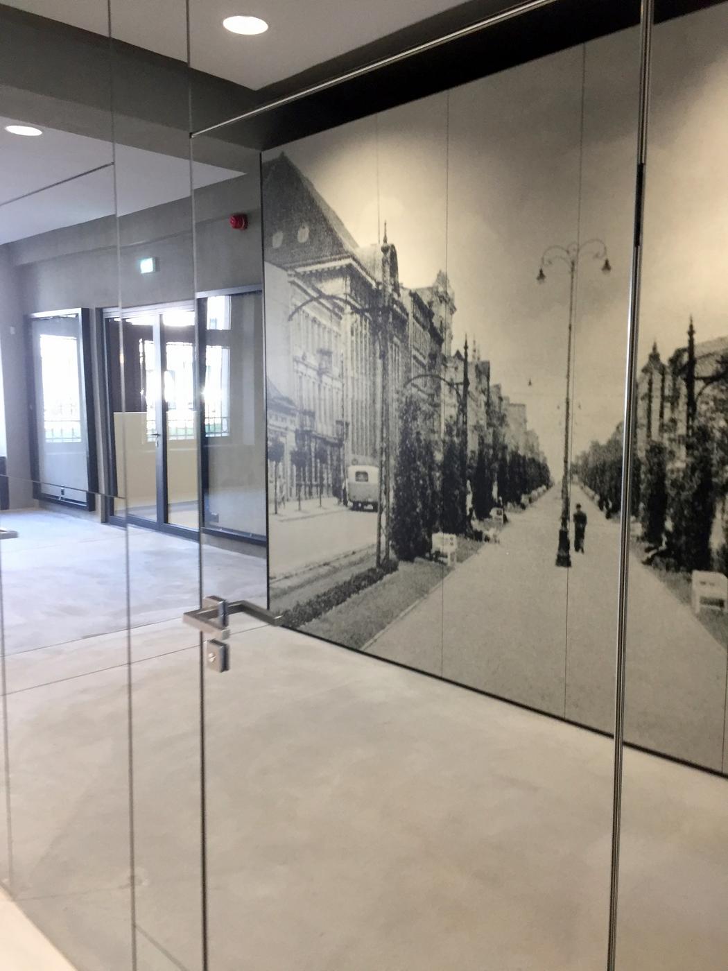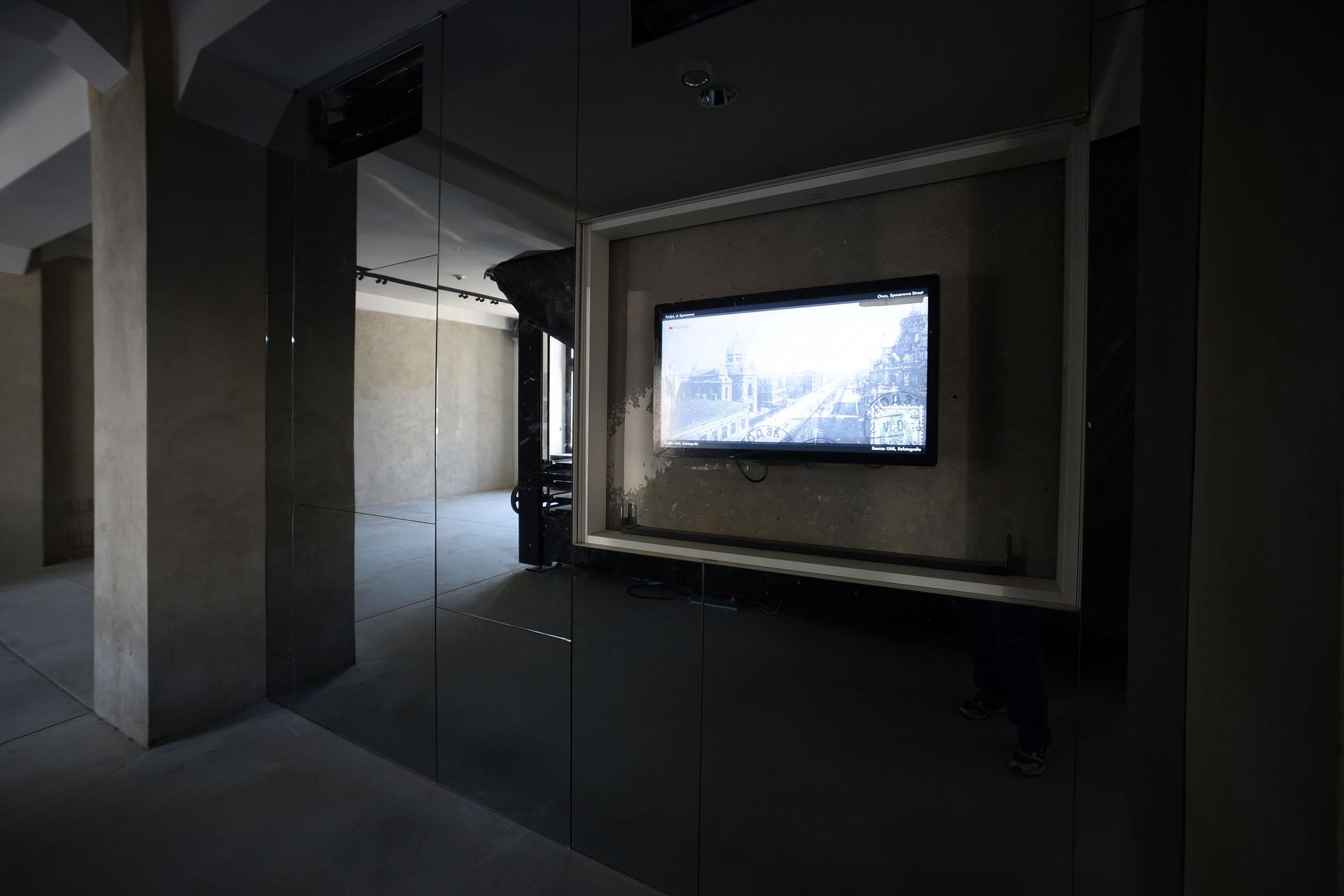 Dodatkowo za lustrzaną ścianą wyświetlane są zdjęcia porównujące historyczny i współczesny wygląd ulic i placów.