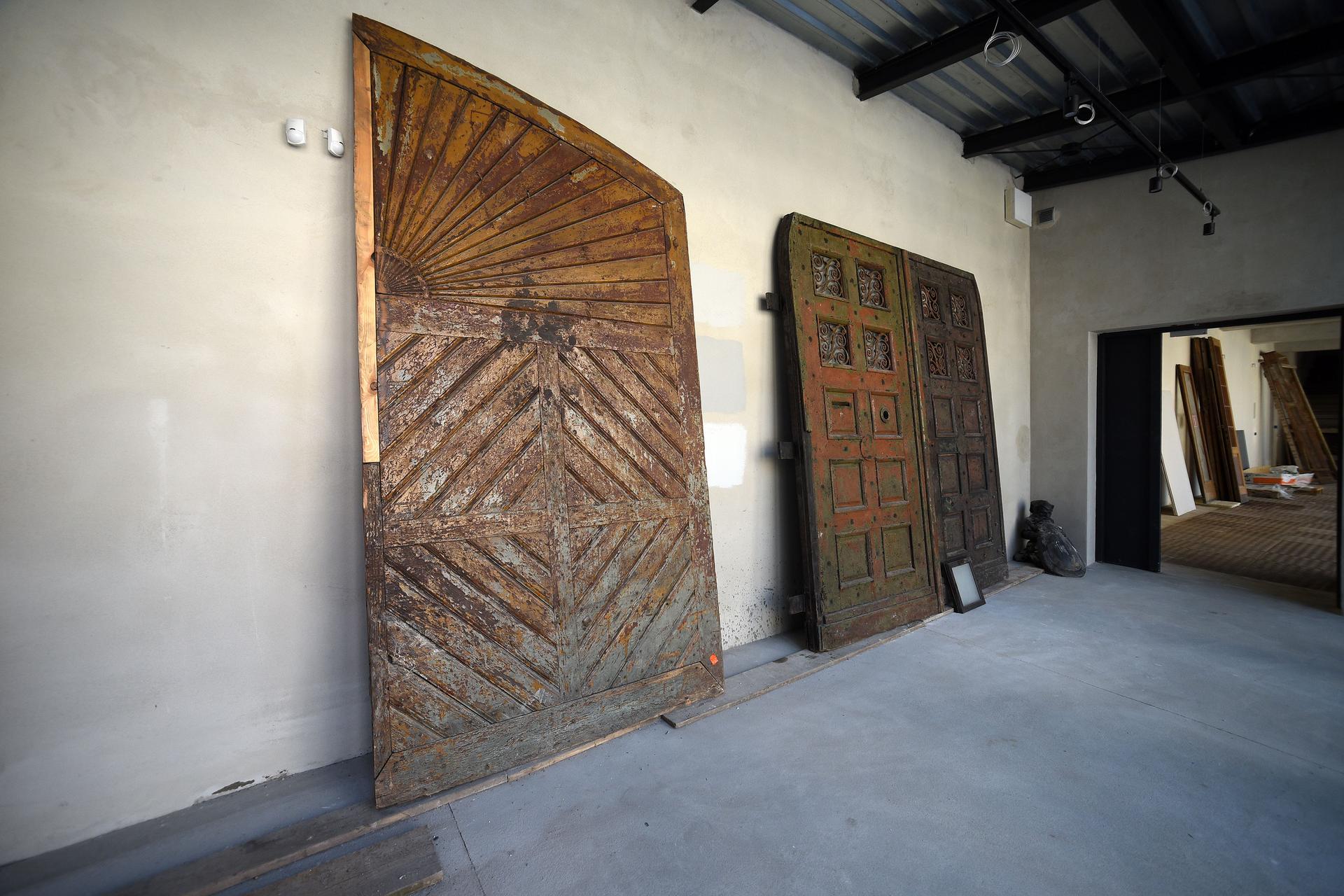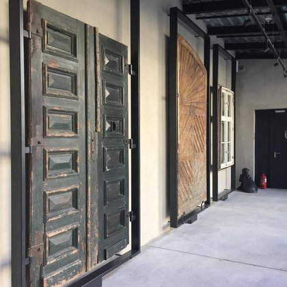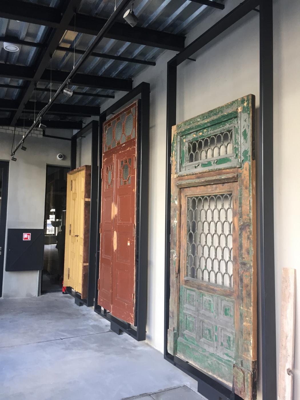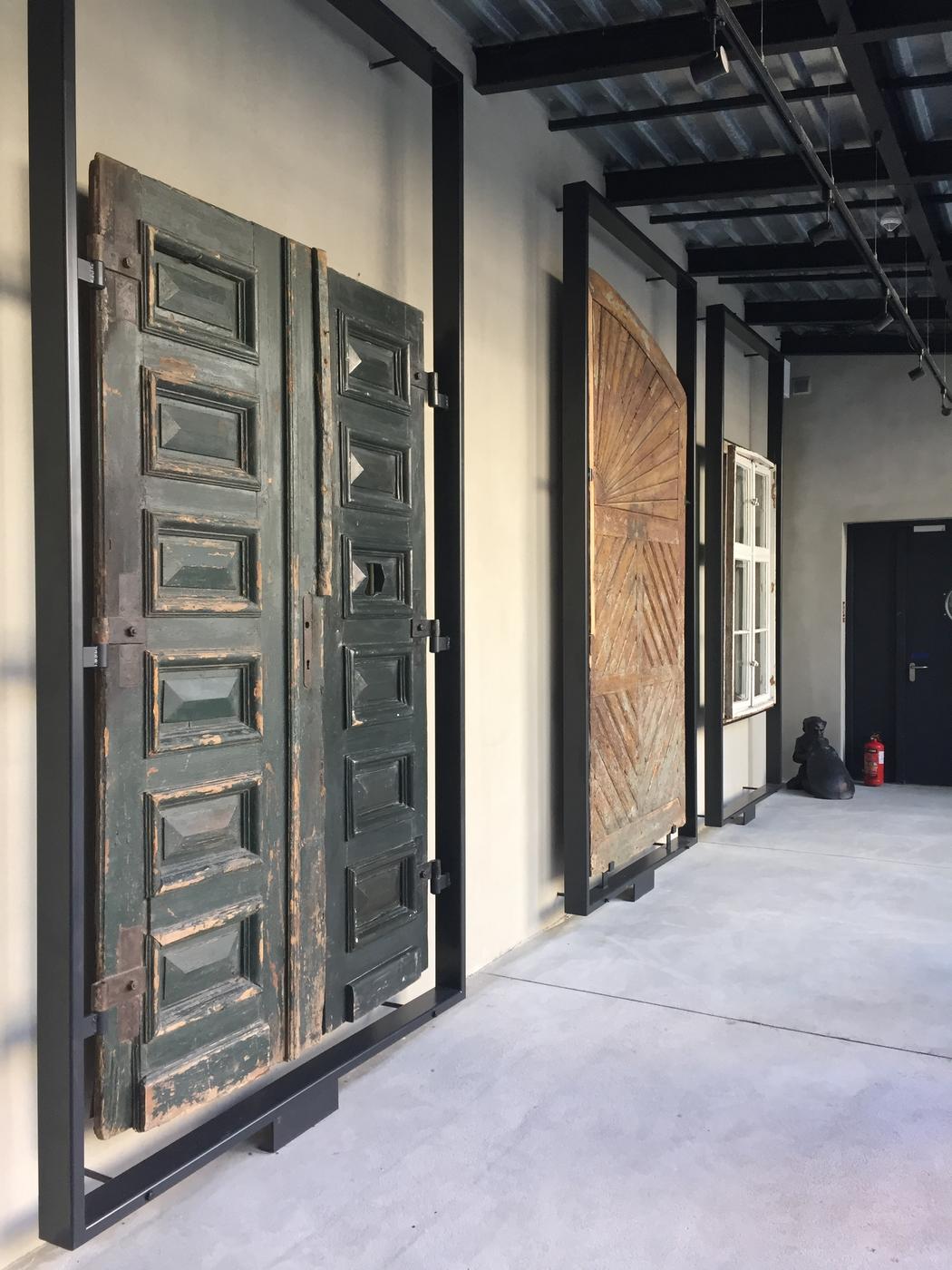 Wzdłuż ściany łącznika prezentowane są elementy zabytkowej stolarki otworowej, m.in. wrota bramowe, furtka, czy drzwi z ościeżnicą i nadświetlem. Wszystkie prezentowane elementy znajdują się w różnym stanie zachowania i zaawansowania prac konserwatorskich, dzięki czemu zobrazowane jest nie tylko bogactwo form i zdobień historycznej stolarki otworowej, ale również złożoność procesu konserwacji zabytkowych elementów budynków.