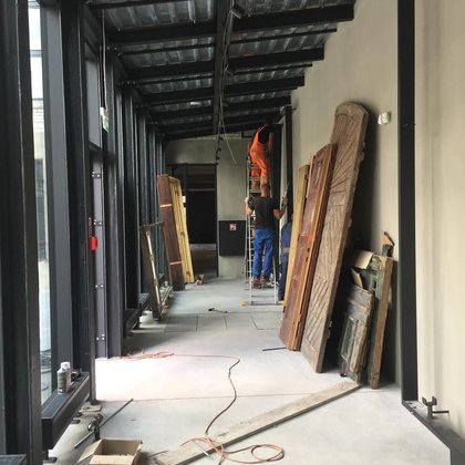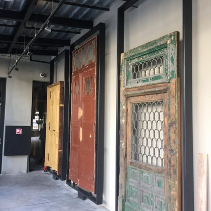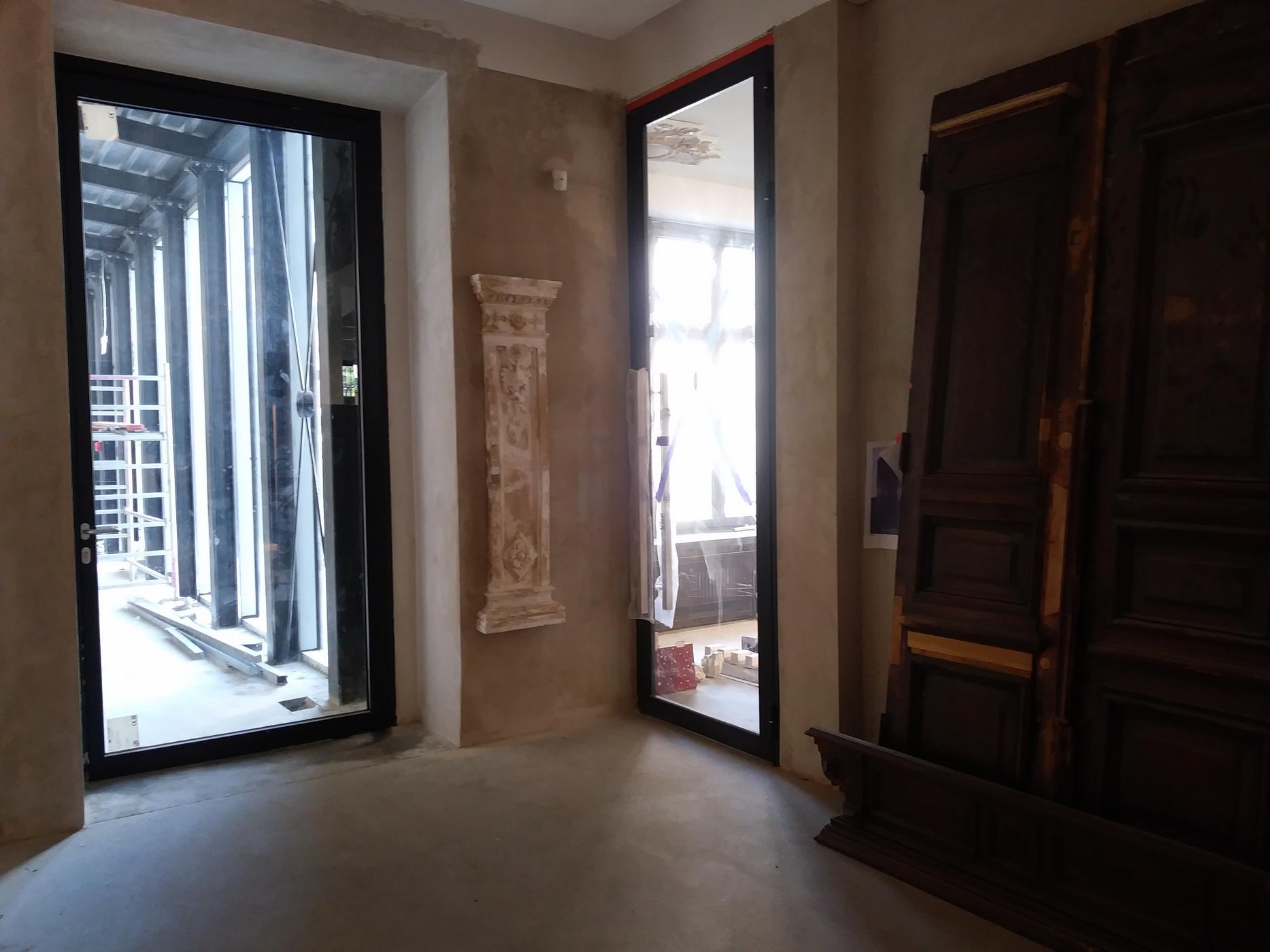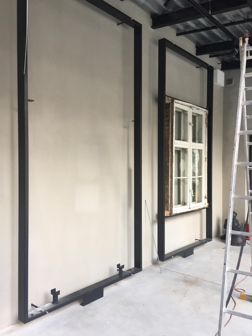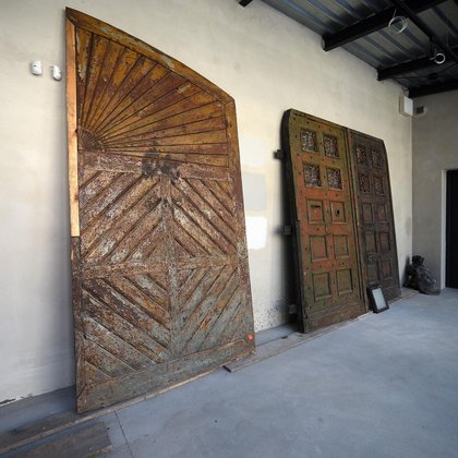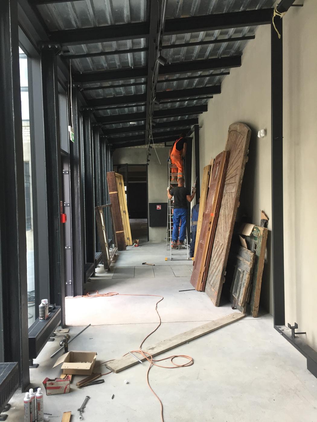 Wzdłuż ściany łącznika prezentowane są elementy zabytkowej stolarki otworowej, m.in. wrota bramowe, furtka, czy drzwi z ościeżnicą i nadświetlem. Wszystkie prezentowane elementy znajdują się w różnym stanie zachowania i zaawansowania prac konserwatorskich, dzięki czemu zobrazowane jest nie tylko bogactwo form i zdobień historycznej stolarki otworowej, ale również złożoność procesu konserwacji zabytkowych elementów budynków.