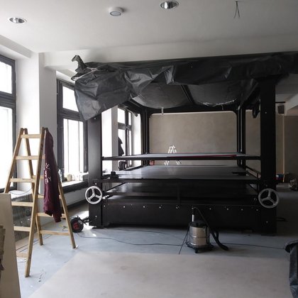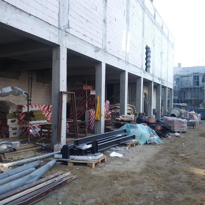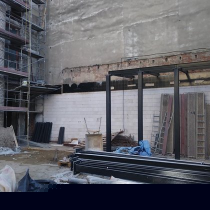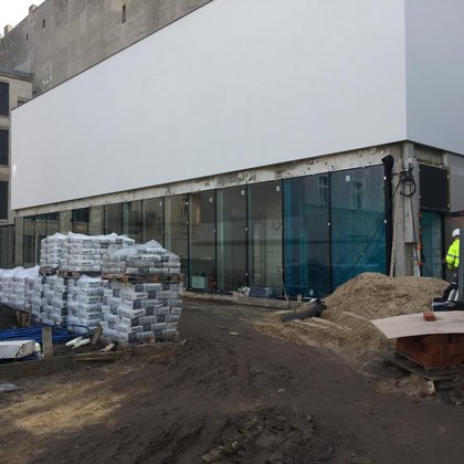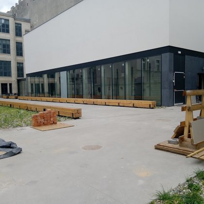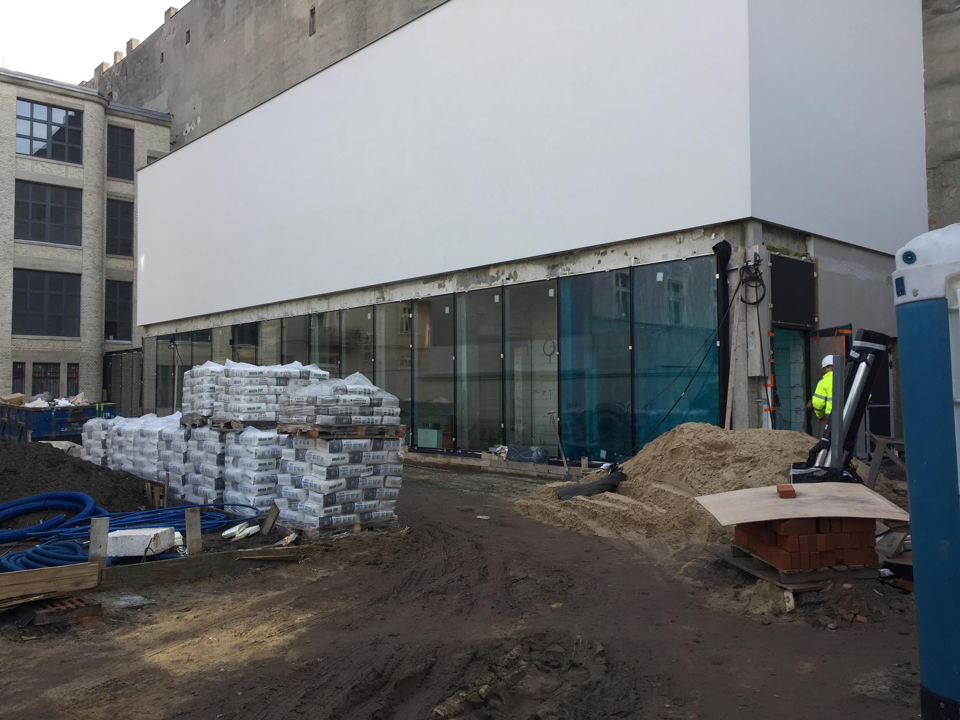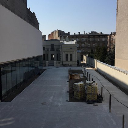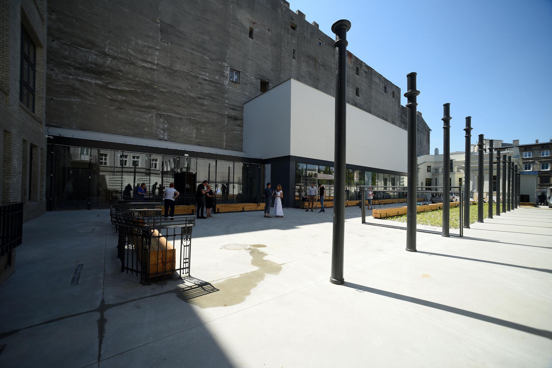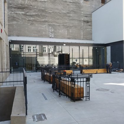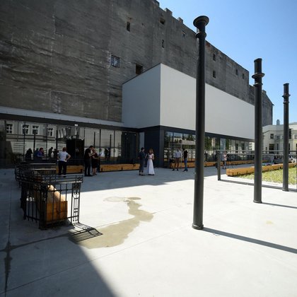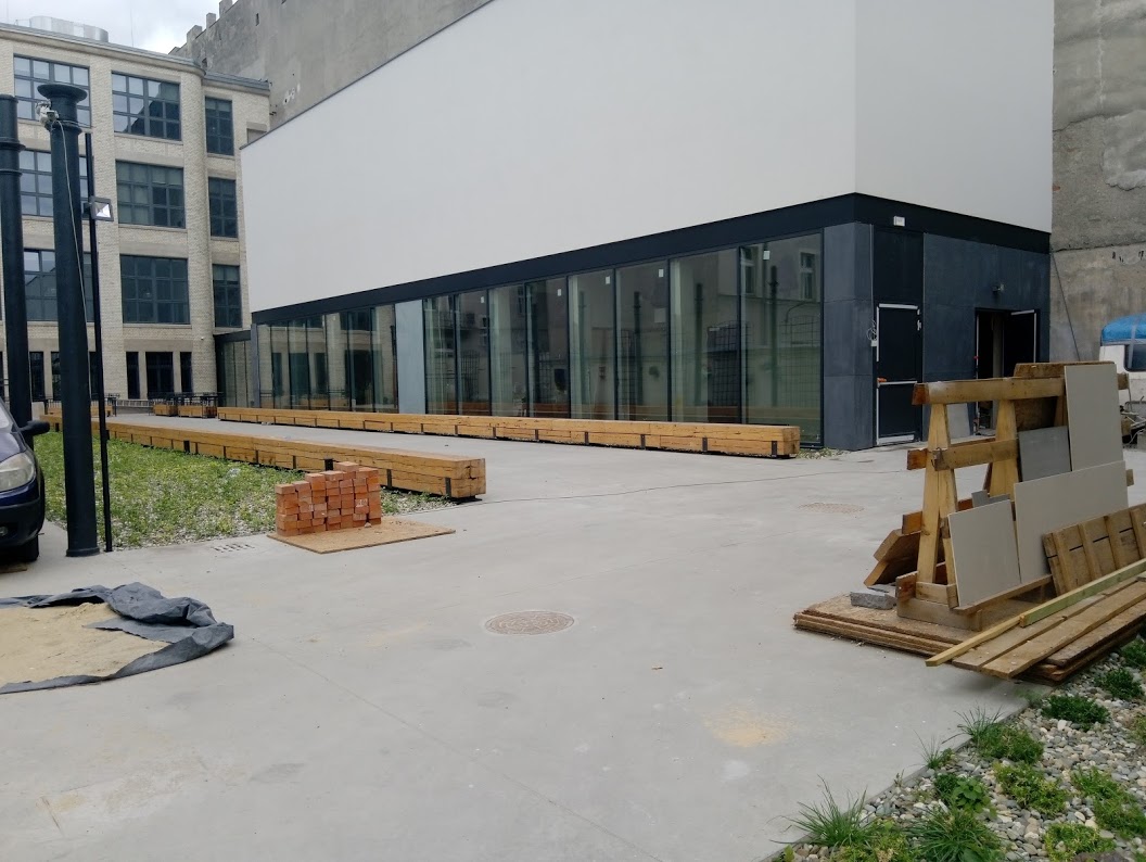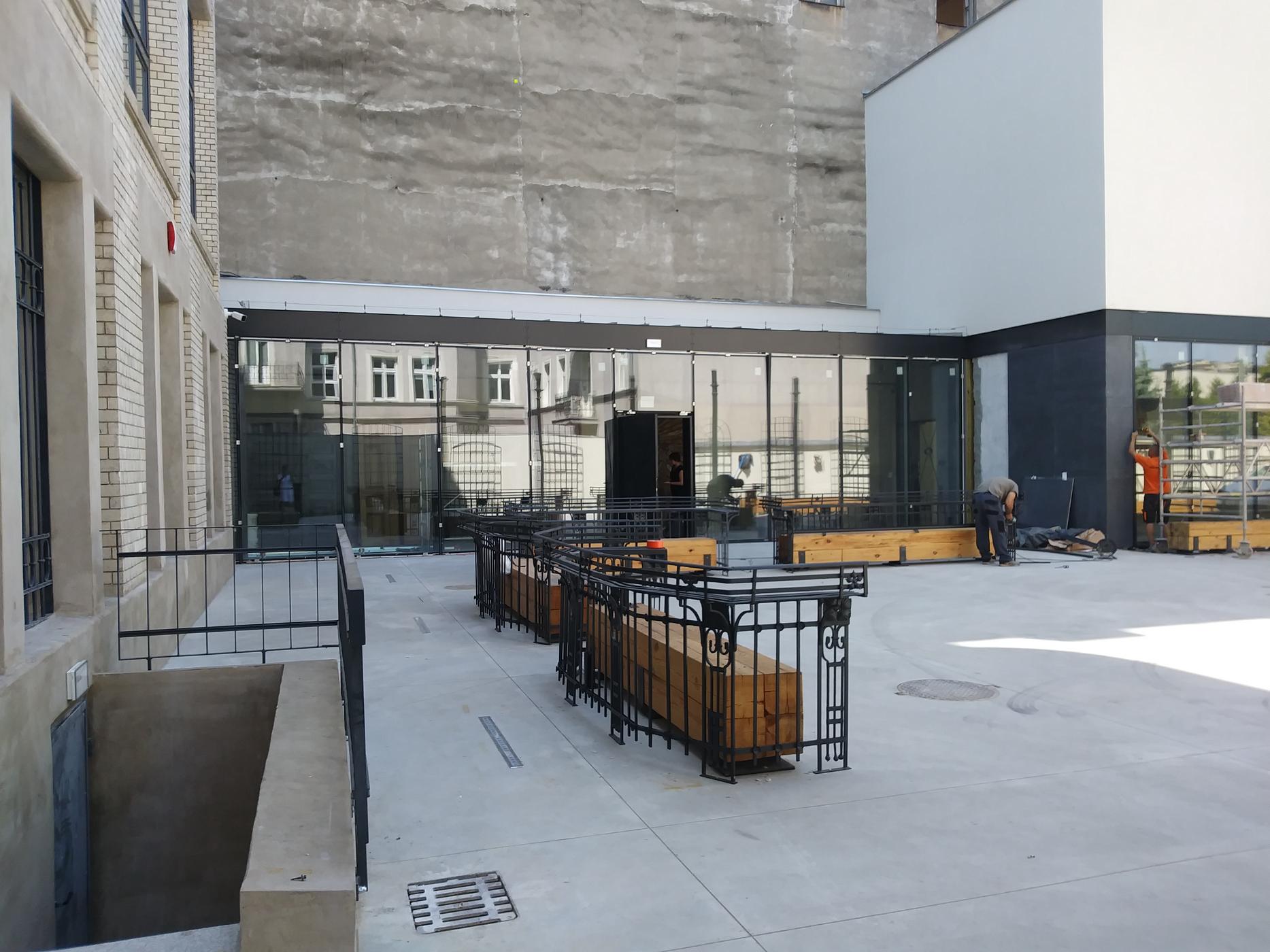 Dziedziniec może również zamienić się w plenerowe kino, gdyż elewacja Magazynu zaprojektowana została w taki sposób, aby można było na niej wyświetlać obraz.