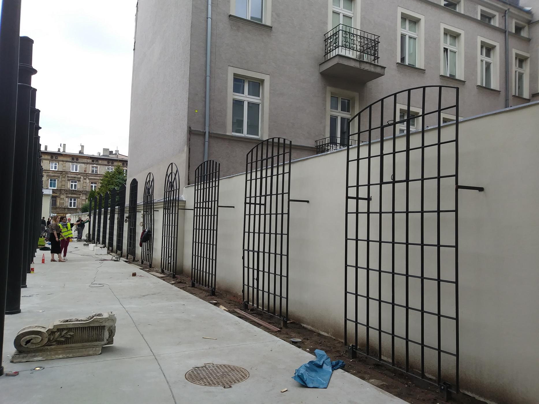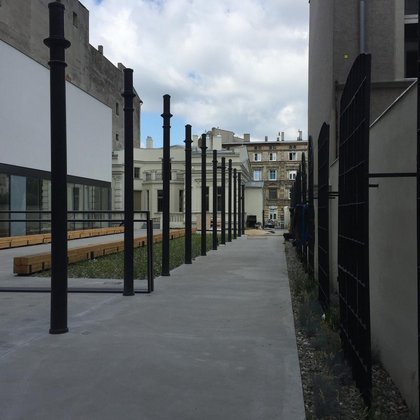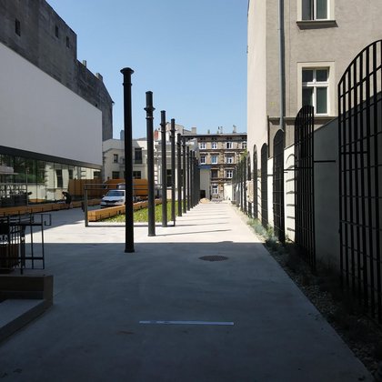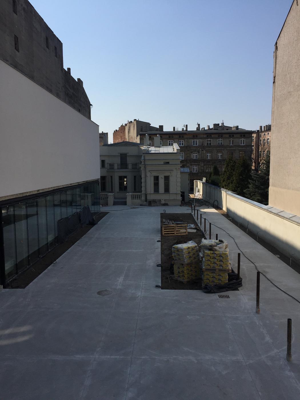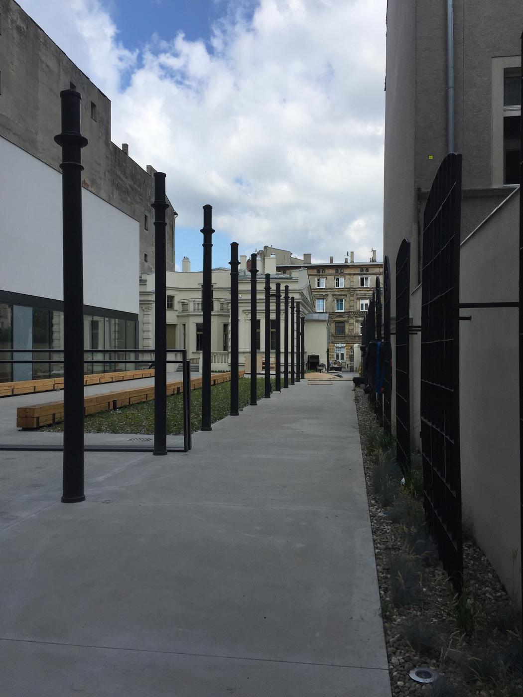 Na świeżym powietrzu prezentowane są detale architektury przemysłowej: żeliwne słupy niegdyś podtrzymujące stropy w budynkach fabrycznych i okna fabryczne z charakterystycznym drobnym podziałem, a także detale pochodzące z elewacji łódzkich kamienic. Również ławki wykonane zostały z wykorzystaniem zabytkowych balustrad balkonowych i starych drewnianych belek stropowych.