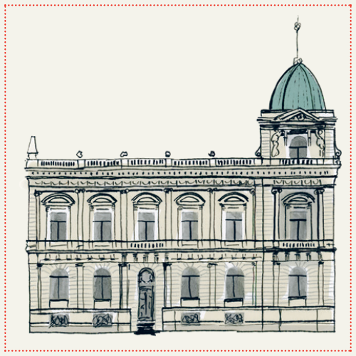 Dom Towarzystwa Akcyjnego Ludwika Geyera wzniesiony został na narożnej działce u zbiegu ul. Piotrkowskiej i ul. Moniuszki (dawniej Pasaż Meyera). Powstał według projektu Juliusza Junga w 1886 r. Jak wiele gmachów tego okresu wzniesionych w reprezentacyjnej części ul. Piotrkowskiej, wykorzystywał formy dojrzałego renesansu włoskiego. Ze względu na swoją skalę i okazały charakter nazywany był Pałacem Geyera.