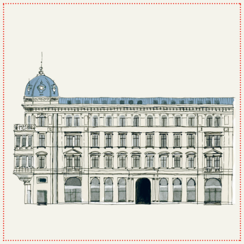 Kamienica o neorenesansowej formie wzniesiona w latach 1880-1882 według projektu berlińskiej firmy architektonicznej "Koule & Lehmann" przez Karola Scheiblera (1820-1881), właściciela największych łódzkich zakładów przemysłowych, ukończona już po śmierci fabrykanta. Stanowiła położoną w centrum miasta wizytówkę jego firmy. Ze względu na wystawną formę nazywana „pałacem” lub „hotelem”, ponieważ mieściła również część hotelową przeznaczoną dla gości przedsiębiorstwa. Jest pierwszą wielkomiejską kamienicą, jaka stanęła przy ul. Piotrkowskiej.
