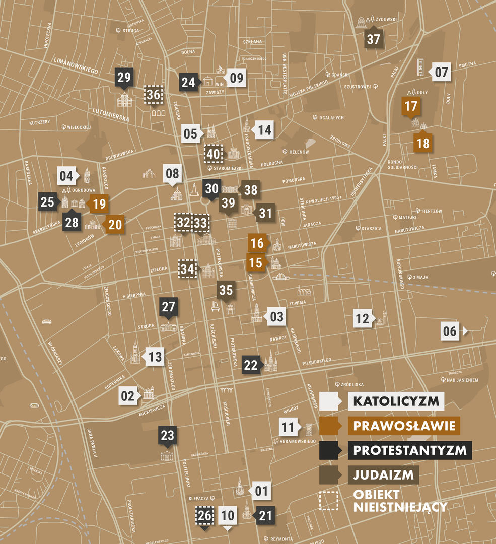 Obiekty oznaczone na ścieżce to budowle, które przed rokiem 1939 znajdowały się w ówczesnych granicach Łodzi. Wśród nich znajdują się zarówno kościoły i domy modlitwy, jak i nekropolie, czy budynki związane z tradycjami i zwyczajami czterech religii i czterech różnych kultur. Wiele z nich nie zachowało się do dzisiaj, a świadectwem ich obecności są jedynie obeliski lub miejsca pamięci. Niektóre obiekty zmieniły swój wygląd zewnętrzny, albo przeznaczenie. Wszystkie jednak warte są zapamiętania, gdyż stanowią niezaprzeczalnie cenne wielokulturowe dziedzictwo materialne Łodzi.