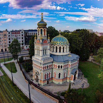 Cerkiew garnizonowa wzniesiona w latach 1895-1896 według projektu Franciszka Chełmińskiego. Świątynia ufundowana przez łódzkich fabrykantów przeznaczona głównie dla stacjonujących w pobliskich koszarach żołnierzy armii rosyjskiej. Po 1918 r. budynek przekazano kościołowi rzymsko-katolickiemu, na którego zlecenie dokonano przebudowy, m.in. usuwając cebulaste kopuły wież. Do dziś pełni funkcję kościoła katolickiego garnizonu łódzkiego, pw. św. Jerzego.